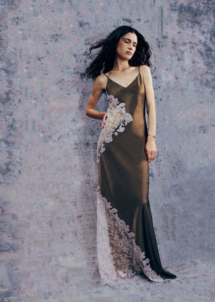 amal gown in dark green lace combo