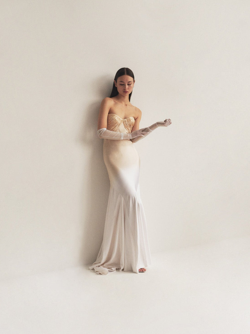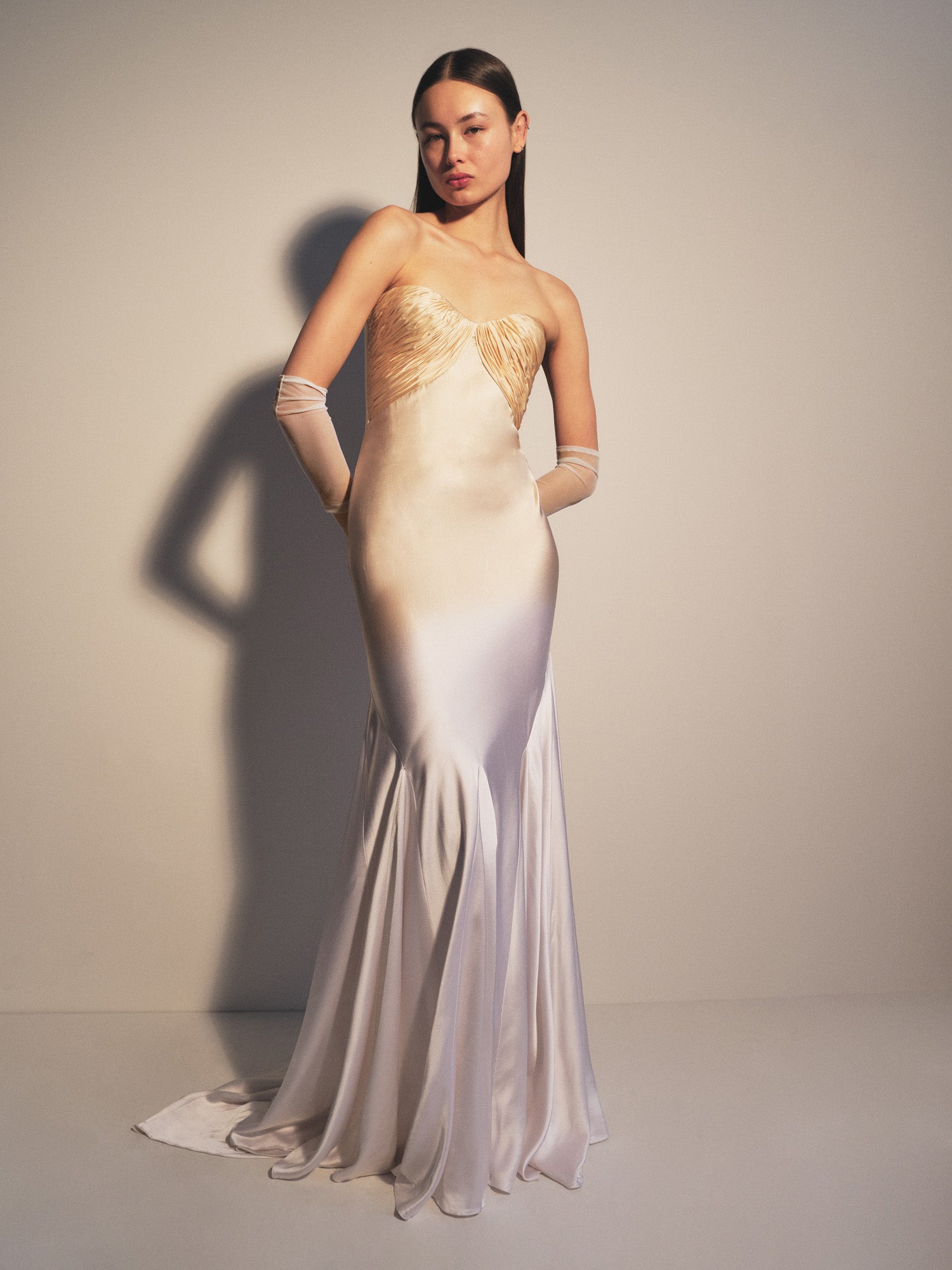 The Blank Canvas collection offers a fresh take on bridal and event wear, allowing you to order your favorite styles in a broad color palette of solids and brand signature or custom prints. Each piece is meticulously crafted using the finest materials and techniques to showcase a range of silhouettes from flowing gowns to chic separates, all customizable to celebrate individuality and make women feel and look their best. The Bustier Gown with Godets is shown here in Ecru with Tea dyed degrade.