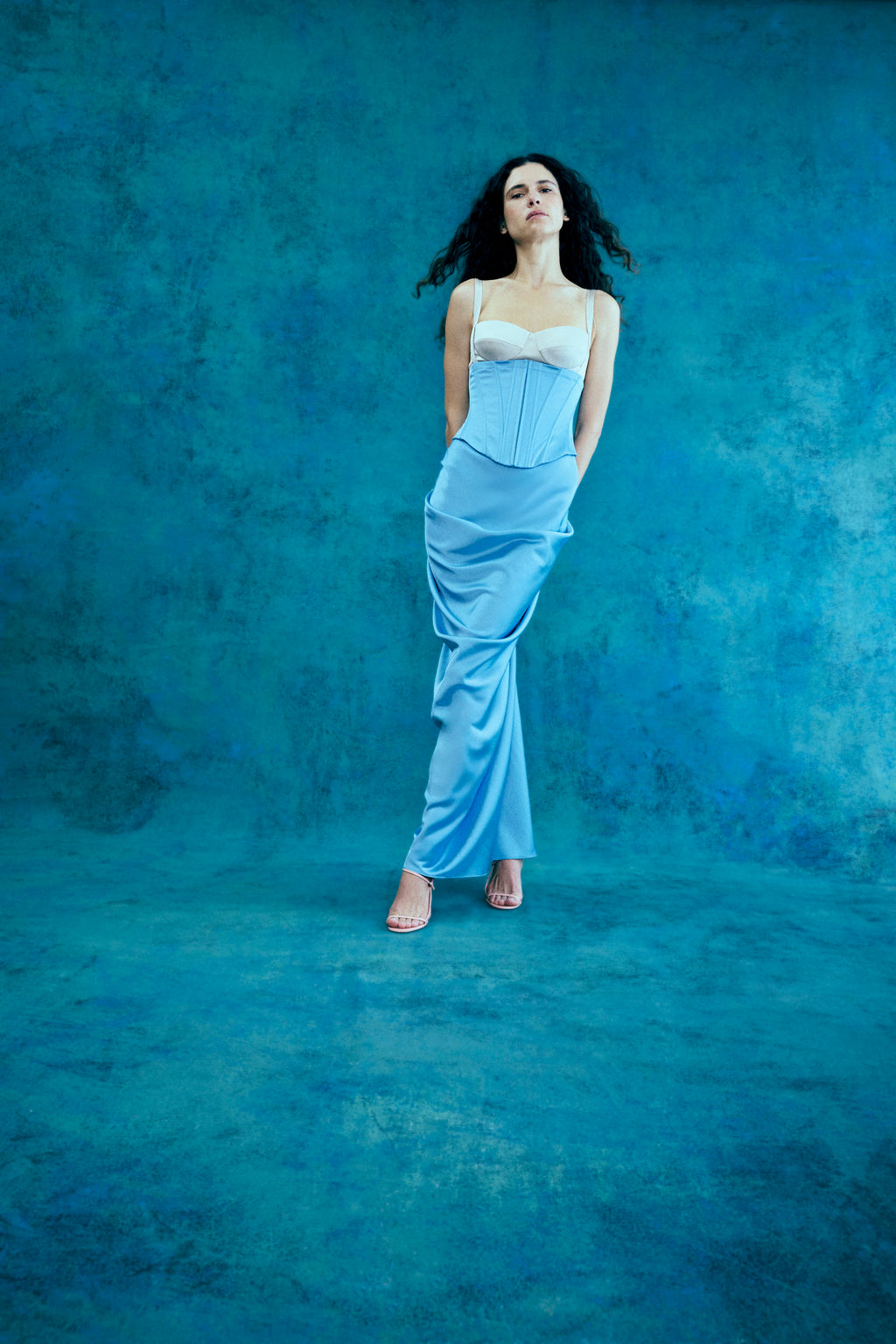 A corset dress with draped detail, thoughtfully designed to create an alluring silhouette.