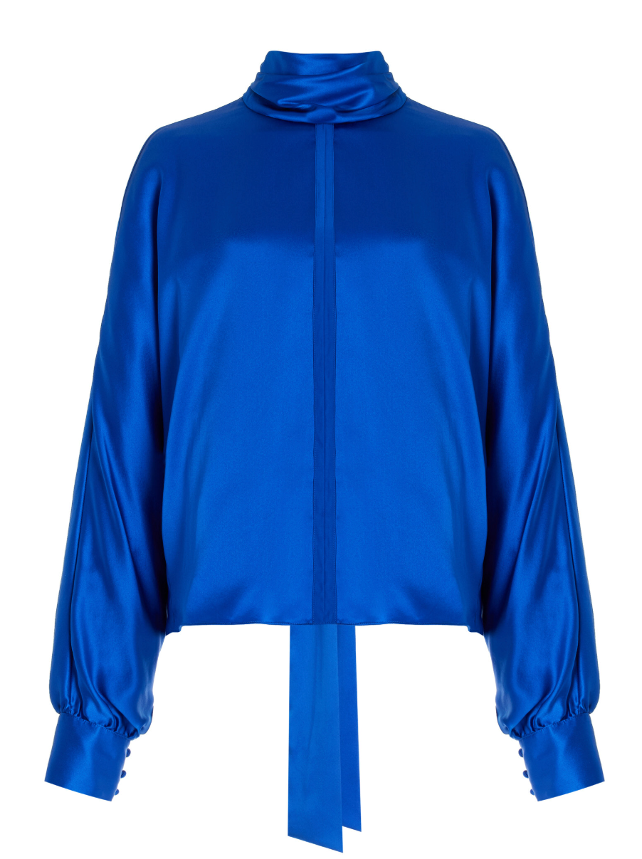 Elevate your wardrobe with our tie silk blouse, featuring luxurious winged sleeves and an exposed hem for a modern flair. The versatile scarf tie can be worn in front or back, allowing you to personalize your look effortlessly.